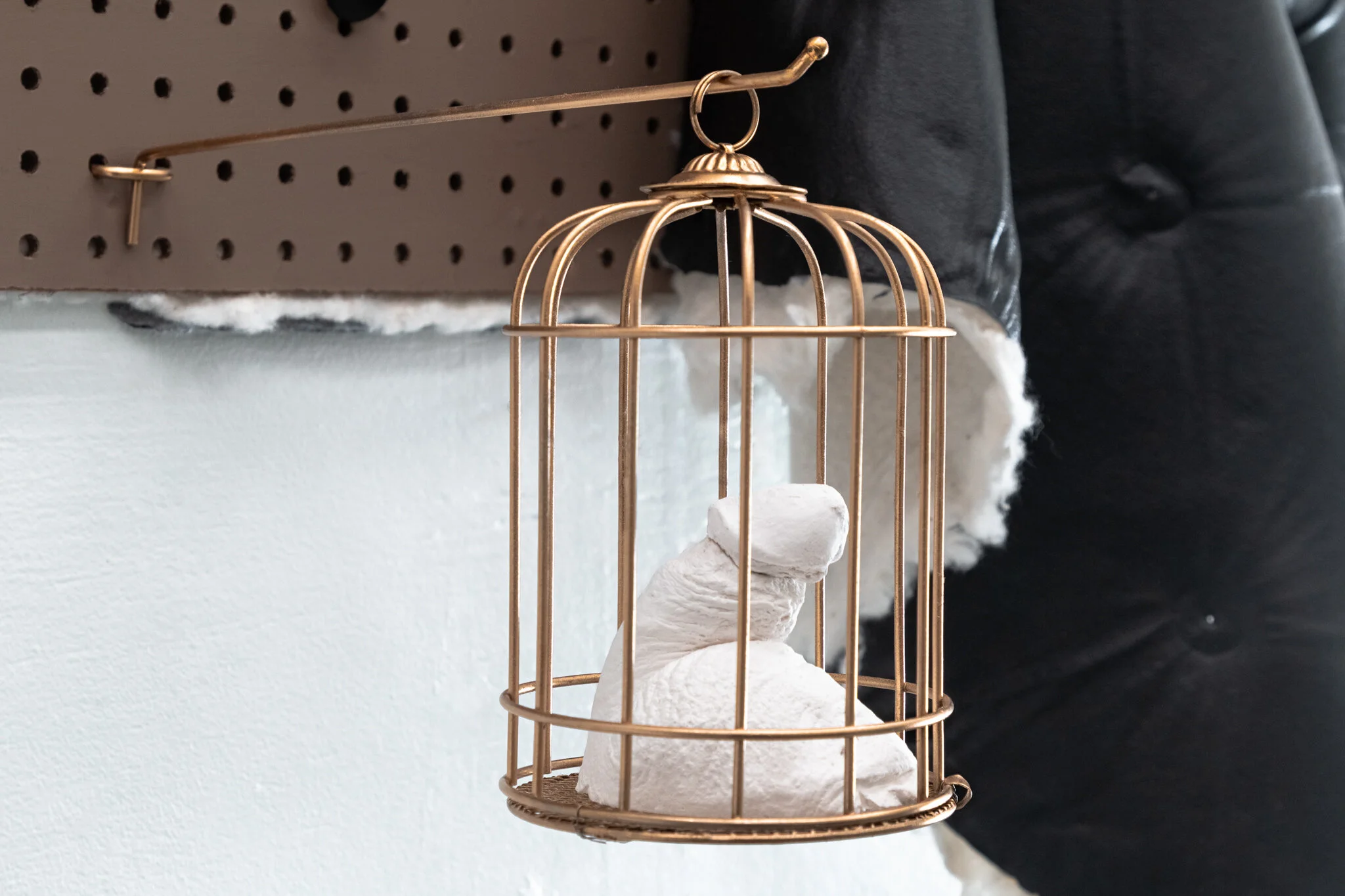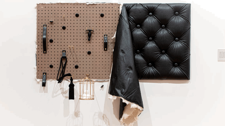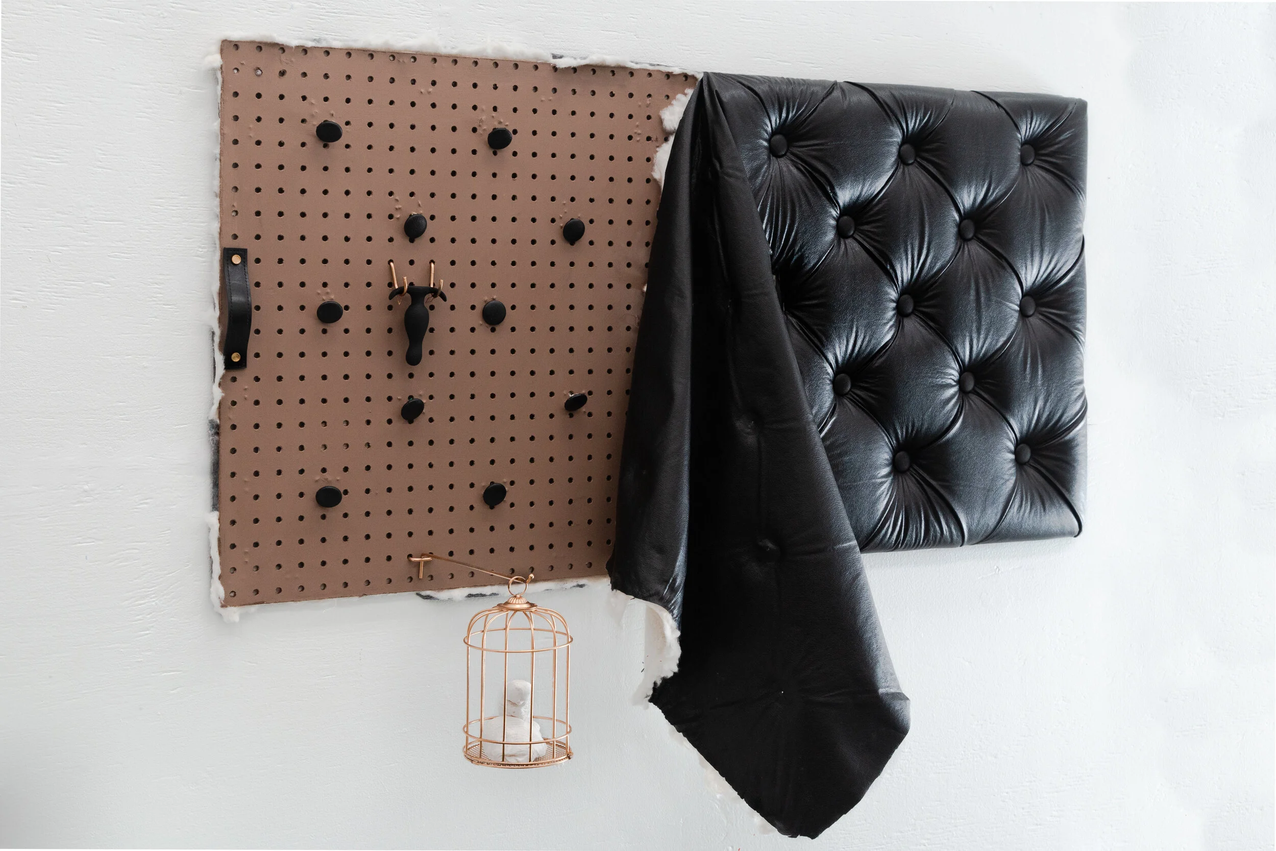 Strip-Tease hand-made leather upholstery, MDF pegboard, plaster, found objects. December 2020
